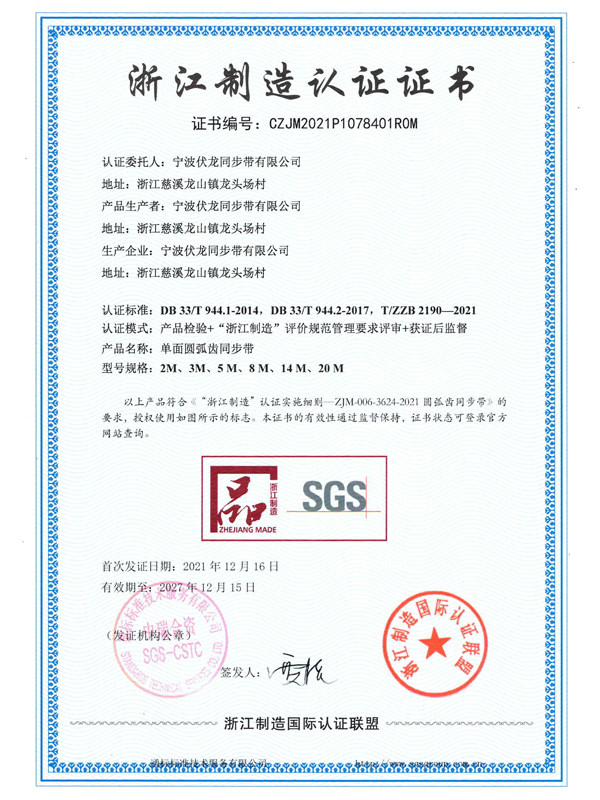 2021年12月15日,寧波伏龍同步帶有限公司制訂的《單面圓弧齒同步帶》經(jīng)浙江制造國際認(rèn)證聯(lián)盟頒證,證書編號(hào):CZJM2021P1078401ROM。